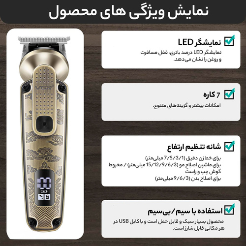 ست ماشین اصلاح موی سر و صورت و بدن وی جی آر مدل V-095 با طراحی به روز، باکیفیت و شیک، انتخابی عالی برای آقایانی است که به ظاهر خود اهمیت میدهند. این دستگاه با 6 سری مختلف شامل تریمر برای اصلاح موی سر و صورت، تریمر برای اصلاح دقیقتر، تریمر مناسب طراحی خط ریش و سبیل، موزن گوش و بینی، اصلاح موی بدن و سری فویلی برای اصلاح موی صورت، تمامی نیازهای اصلاح شما را برآورده میکند. باتری لیتیومی 1200 میلیآمپرساعتی این دستگاه با یک بار شارژ 90 دقیقهای، تا 180 دقیقه کارایی دارد و صفحه نمایش ال ای دی آن میزان شارژ باقیمانده را نمایش میدهد. این ماشین اصلاح قابل شستشو بوده و دارای گواهی IPX6 است که مقاومت آن در برابر آب را تضمین میکند. اقلام همراه این دستگاه شامل 12 شانه برای اصلاح موی سر و صورت و بدن، روغن روانکاری، برس تمیزکننده، کابل شارژر، کیف، درپوش محافظ و استند نگهدارنده میباشد. با این ست کامل، تجربهای حرفهای و راحت از اصلاح خواهید داشت.